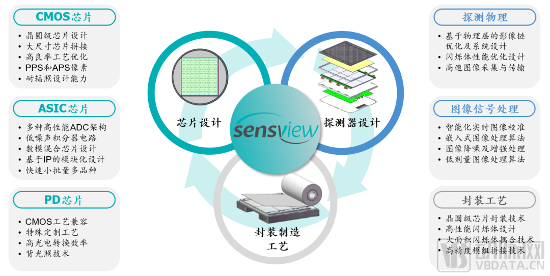 探测器是影像设备中最具技术含量及价值的零部件之一,其技术难度主要体现在底层芯片设计、探测器系统设计、封装制造工艺三个层面。善思微从底层芯片能力出发,已掌握探测器从研发到生产的关键技术和工艺,而这主要依赖善思微拥有芯片、辐射探测、医学影像复合背景的技术团队,以及丰富的芯片及探测器产品研发经验。善思微核心团队曾参与全球领先的第六代静态CT专用探测器芯片及部件的研发,同时通过自主攻关,历时不到两年成功研发了第一款国产晶圆级CMOS成像芯片及CMOS平板探测器。